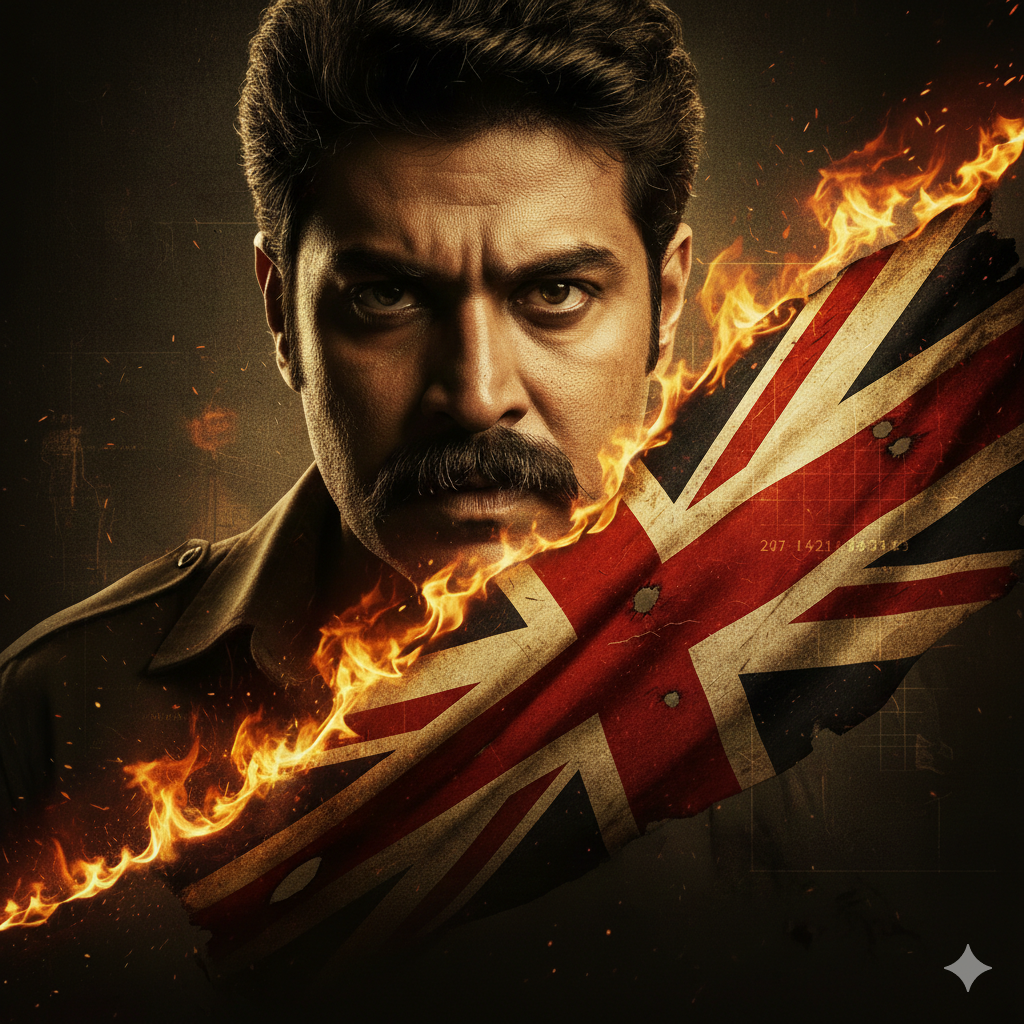 First ask user to upload an image for reference. A high-quality cinematic movie poster featuring a close-up, intense portrait of a man with face same as reference image, with a mustache and a determined expression. His face is partially shadowed. In the foreground, a tattered, burning British Union Jack flag creates a dramatic diagonal division across the frame. The background is filled with faint, glowing Sanskrit calligraphy and semi-transparent military grid coordinates. The overall color palette is dark, sepia, and gritty with high contrast. Professional film lighting, 8k resolution, epic historical war drama style. Keep the face 100% same.