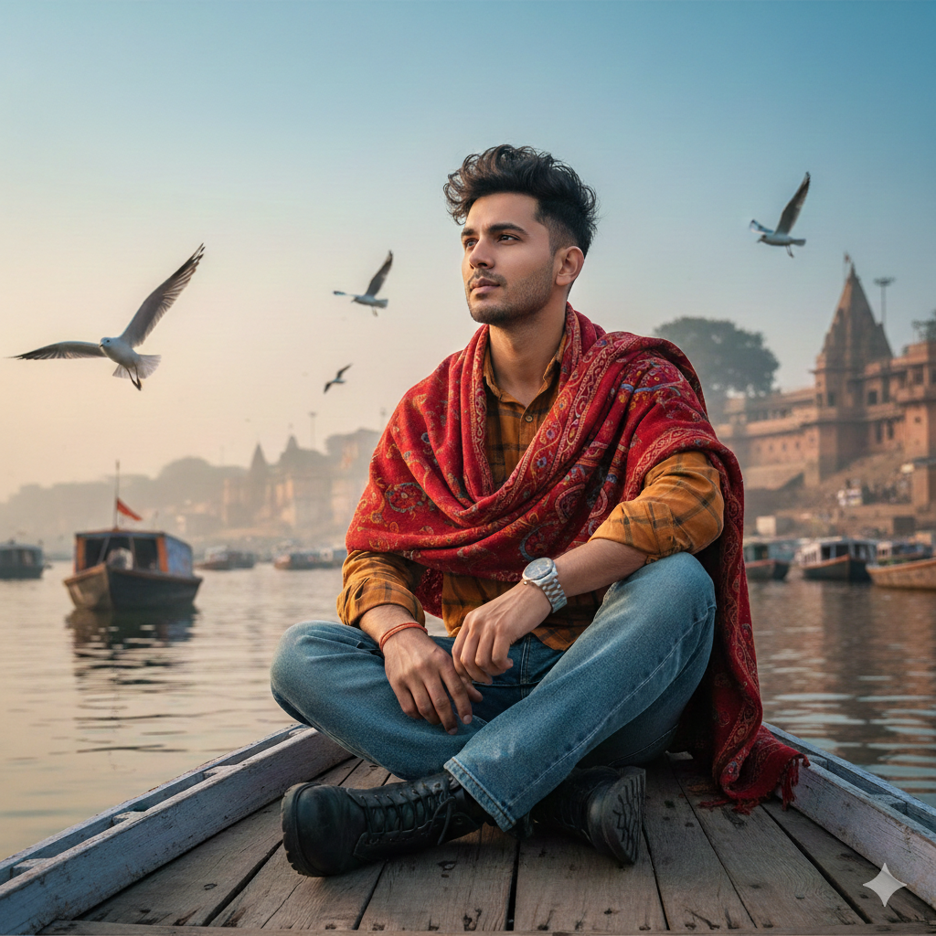First ask the user to upload a reference image. An ultra-realistic 8K cinematic portrait in a 4:5 aspect ratio. A young man with face similar to the reference image sits cross-legged on the wooden bow of a traditional rowing boat on the Ganges River at dawn. He is wearing a mustard-orange plaid flannel shirt, baggy blue denim jeans, and rugged black boots, with a rich red Kashmiri shawl draped over his shoulders and a silver watch on his wrist. The background features the hazy, soft blue morning sky of Varanasi, with the ancient Kashi Ghats and temple silhouettes blurred in the distance. Several seagulls are captured in mid-flight around him. The lighting is soft and ethereal, capturing the spiritual atmosphere of the morning. MPORTANT - FACE LOCK Keep the subject's face real exactly the same as the reference image. Do NOT change facial structure, jawline, eyes shape, nose, lips, skin tone, beard, hairline or age. Maintain 100% identity accuracy. No beautification, no face swapping, no AI alteration. Preserve natural skin texture, pores, asymmetry and imperfections.