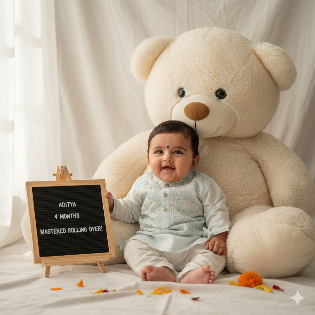 A high-quality, professional studio photography shot of a cheerful Indian baby boy named Aditya. He is sitting supported against a giant, soft cream-colored teddy bear. He is wearing a light blue and white traditional Indian clothes with delicate embroidery. To his left is a small black letter board on a wooden easel that reads 'ADITYA, 4 MONTHS, MASTERED ROLLING OVER!'. The background is a soft, draped white fabric with warm, natural sunlight coming from a side window. The floor is covered in a white sheet with a few scattered orange and yellow flower petals. The mood is heart-warming, bright, and clean."