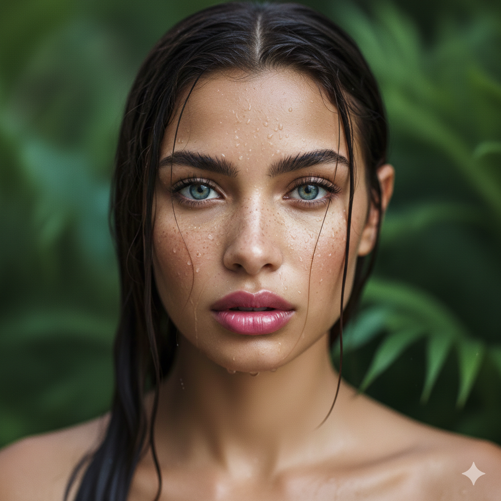{ "subject": { "type": "Indian female model", "expression": "pink bold lips", "eyes": { "color": "piercing blue-green", "expression": "captivating", "gaze_direction": "direct to camera" }, "skin": { "tone": "light brown with freckles", "texture": "high detail with water droplets", "finish": "wet, glossy" }, "hair": { "style": "wet, stringy strands clinging to face", "color": "dark brown" }, "lips": { "shape": "full and glossy", "expression": "natural look" }, "makeup": { "style": "minimal or natural", "features": "enhanced lashes, defined brushed upwards brows" } }, "camera": { "angle": "portrait shot", "lens": "85mm prime lens with shallow depth of field", "focus": "sharp on eyes and water droplets", "framing": "head to collarbone, centered composition" }, "lighting": { "type": "soft directional light", "effect": "emphasizes facial texture and moisture", "highlights": "wet skin glistens, reflections in eyes" }, "mood": "natural beauty", "style": "beauty editorial, cinematic realism", "background": { "elements": "out of focus, hints of green foliage", "blur_level": "heavy (bokeh)" } }