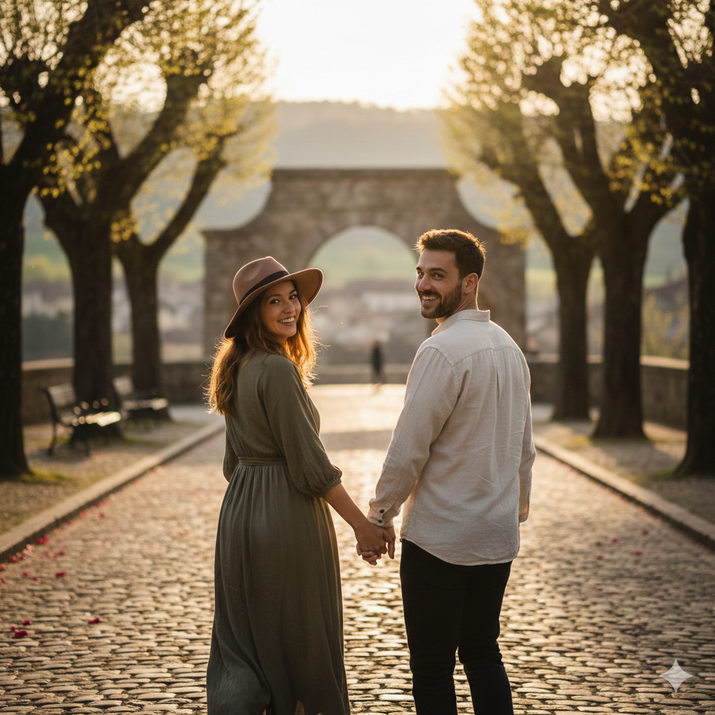 First ask the user to upload image of two people. A high-resolution, cinematic medium shot from behind of a young couple faces same as reference photos holding hands while walking away on a cobblestone path. The woman, face same as reference image, is wearing an olive green maxi dress and a brown wide-brimmed felt hat, looking back over her shoulder with a warm smile. The man, face same as reference image, is wearing a light beige linen shirt and dark trousers, also looking back. They are framed by a row of lush green trees on both sides, leading toward a historic stone archway in the distance. The scene is bathed in the warm, golden glow of a sunset, with soft lens flare and a shallow depth of field, creating a dreamy, romantic travel-vibe atmosphere. Keep the faces 100% same.