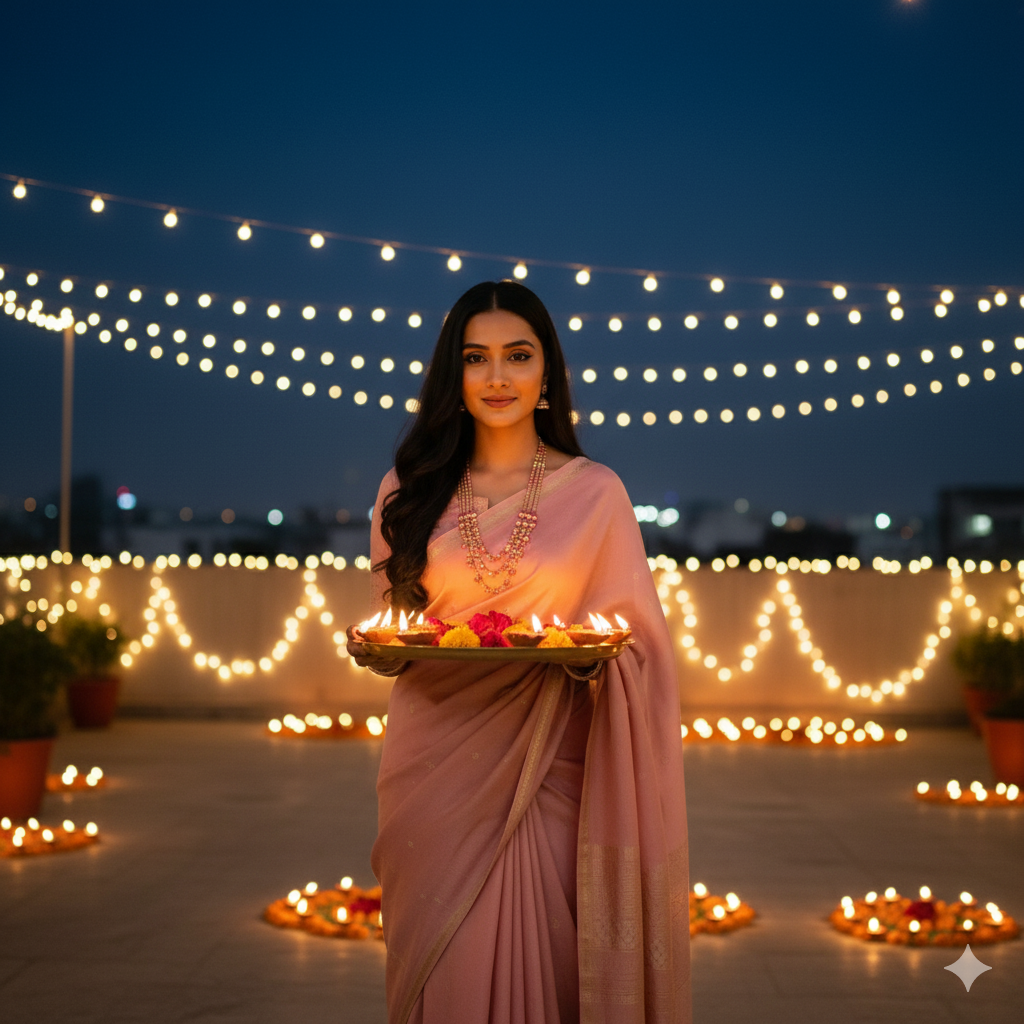 Cinematic Diwali Portrait of Girl in Pink Saree Holding Traditional Thali on Rooftop at Night