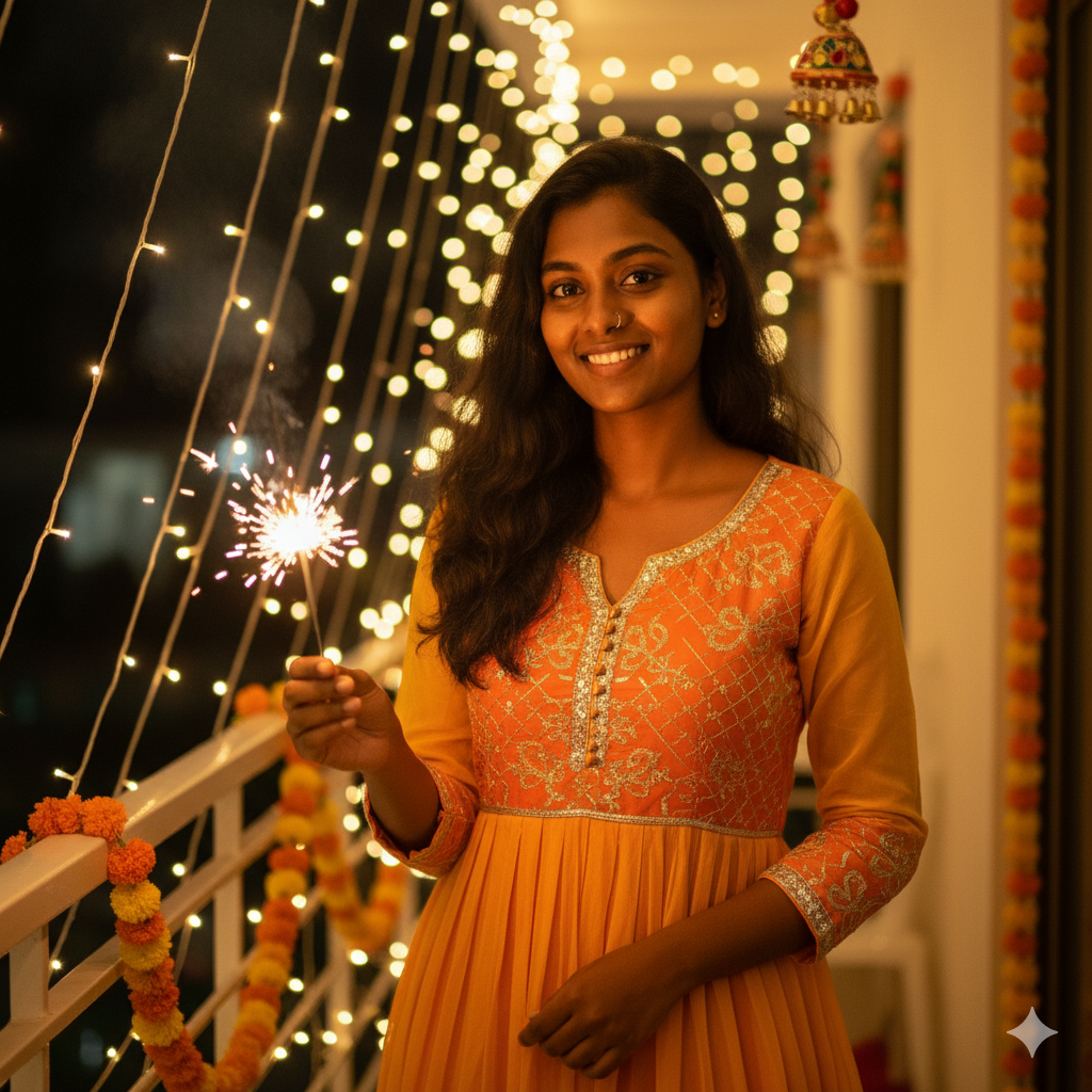 Use Uploaded Photo as Reference for Face and Keep the Face and Facial Features Exactly The same do not Change Any Thing. Young Woman Smiling Warmly the Camera.a Vibrant, Photorealistic Portrait of She Wears Festive Orange and Yellow Anarkali-style Dress With Silver Trim. She is Holding Up a Single Lit Sparkler in Her Right Hand. The Background is an Outdoor Balcony at Night, Decorated With Diagonal Strings of Warm Fairy Lights and Traditional Indian Festive Hangings (Torans). Creating a Cheerful and Celebratory Atmosphere..