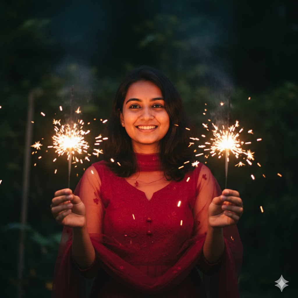 Use Uploaded Photo as Reference for Face and Keep the Face and Facial Features Exactly the Same do not Change Any Thing, a Candid, Photorealistic Shot of Young Woman With a Joyful, Bright Smile, Celebrating at Night She is Dressed in Sheer, Deep Red Indian Outfit. She Holds Two Bright, Lit Sparklers, One in Each Hand, Which Illuminate Her and the Immediate Surroundings With a Shower of Golden Sparks.the Background is Dark and Natural, With Hints Of the Sparklers the Central Focus Outdoor Foliage, Making the Light From Sparklers the Central Focus