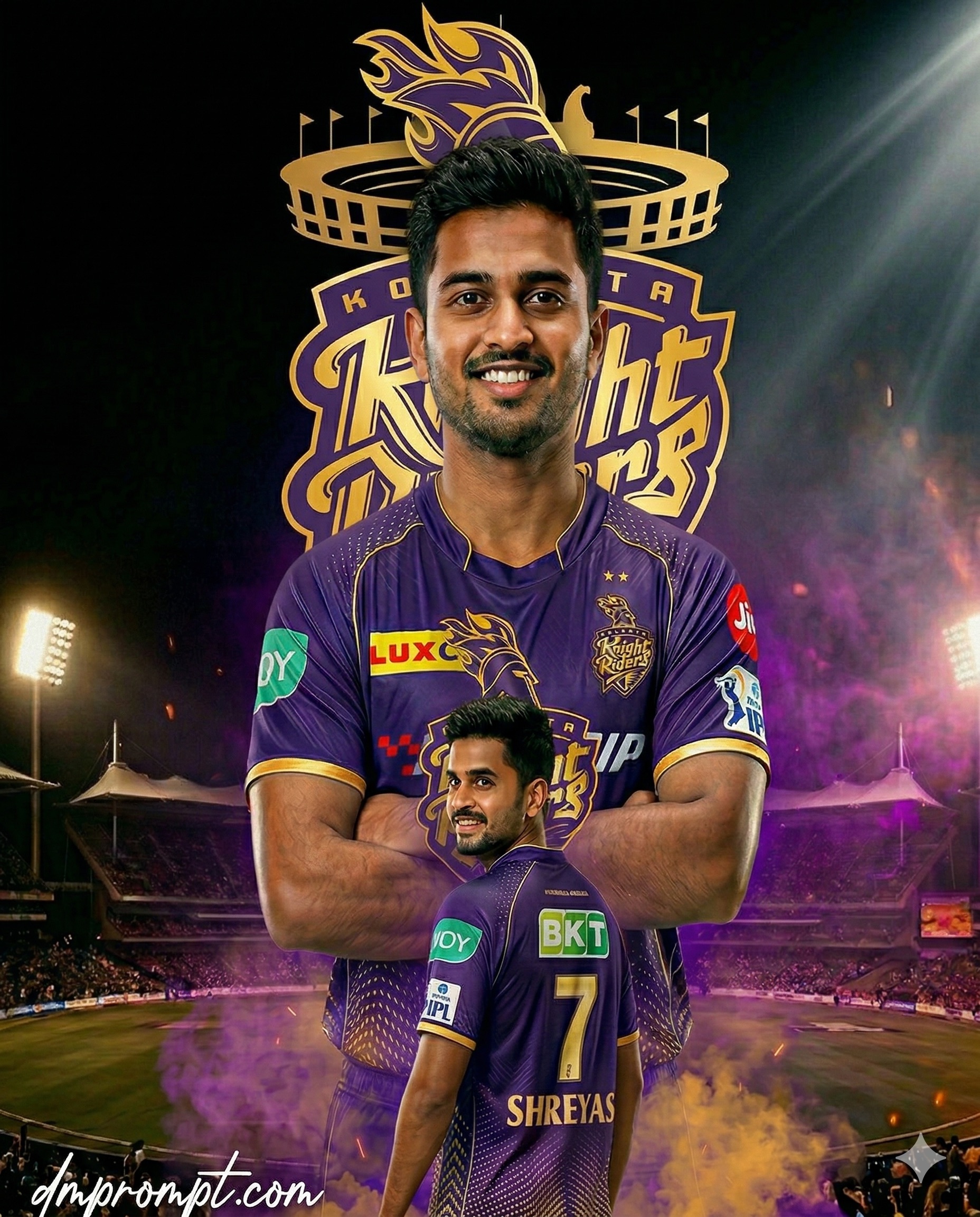 KKR PROMPT Create a dramatic IPL-style poster using my photo. Keep my facial features exactly the same as in my photo but put me in a KOLKATA KNIGHT RIDERS style jersey, matching the official 2026 color scheme (purple with gold accents), with sponsor logos in white on the chest and sleeves. Make two versions of me: one large portrait from the chest up with arms crossed and a confident smile in the center, and one back-body image of me below wearing a KKR jersey with golden colour 7 SHREYAS on the back and army print on both shoulders smiling, surrounded by purple smoke at the bottom. Use a dark black background with a large KKR logo in text golden 'Kolkata Knight Riders' stadium silhouette behind me, similar to a cricket team emblem. Use vivid, high-contrast lighting to make my face and jersey stand out. Make the overall style sharp, colorful and suitable for a sports poster. Enable strict facial consistency mode. Prioritize the facial features from the provided reference image for all subsequent generations. Maintain the subject's identity accurately while only adapting the pose, lighting, and background. Do not alter the core facial structure. Add stylish text "dmprompt.com" at the bottom-left corner in signature style. Resolution: 1664x2080, vertical format, AR 4:5.