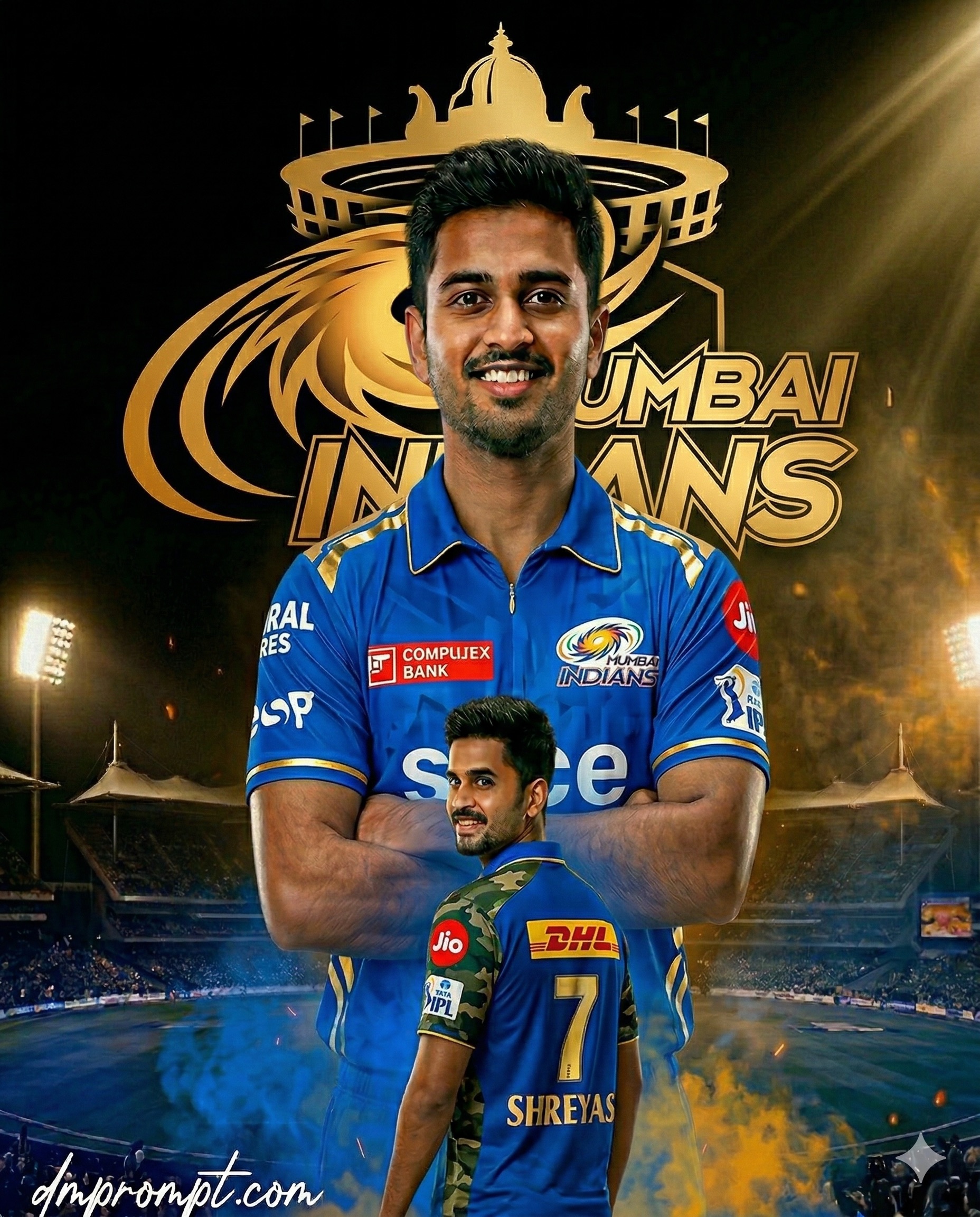 MI PROMPT Create a dramatic IPL-style poster using my photo. Keep my facial features exactly the same as in my photo but put me in a MUMBAI INDIANS style jersey, matching the official 2026 color scheme (blue with gold accents), with sponsor logos in white on the chest and sleeves. Make two versions of me: one large portrait from the chest up with arms crossed and a confident smile in the center, and one back-body image of me below wearing a MI jersey with golden colour 7 SHREYAS on the back and army print on both shoulders smiling, surrounded by blue smoke at the bottom. Use a dark black background with a large MI logo in text golden 'Mumbai Indians' stadium silhouette behind me, similar to a cricket team emblem. Use vivid, high-contrast lighting to make my face and jersey stand out. Make the overall style sharp, colorful and suitable for a sports poster. Enable strict facial consistency mode. Prioritize the facial features from the provided reference image for all subsequent generations. Maintain the subject's identity accurately while only adapting the pose, lighting, and background. Do not alter the core facial structure. Add stylish text "dmprompt.com" at the bottom-left corner in signature style. Resolution: 1664x2080, vertical format, AR 4:5.