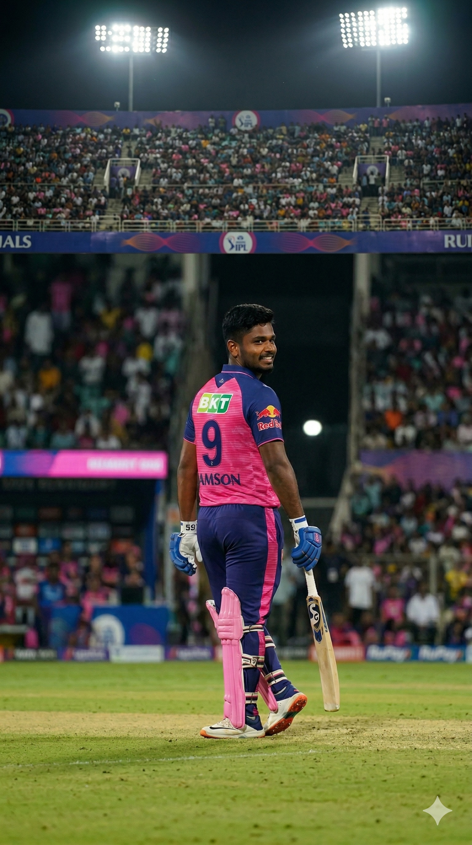 A realistic professional cricket stadium photo of a South Indian batsman. Use the provided face as the reference and keep the facial features exactly the same (do not change identity). Full-body pose: standing on the cricket pitch, body slightly turned, relaxed confident smile, holding a cricket bat in the right hand, wearing blue gloves, pink leg pads, and white cricket shoes. Outfit: Rajasthan Royals (RR) official-style pink jersey with navy/dark blue accents, modern T20 kit look with realistic fabric texture and stitching; clean sponsor logos. Background: packed stadium crowd with blurred spectators (bokeh), bright stadium floodlights, night match atmosphere. Ultra-realistic, high detail, sharp focus, natural skin texture, 4K sports photography, editorial sports portrait. Negative Prompt: face distortion, changed identity, extra fingers, deformed hands, duplicate person, wrong anatomy, blur on face, watermark, cartoon, anime, messy text, misspelled logos.