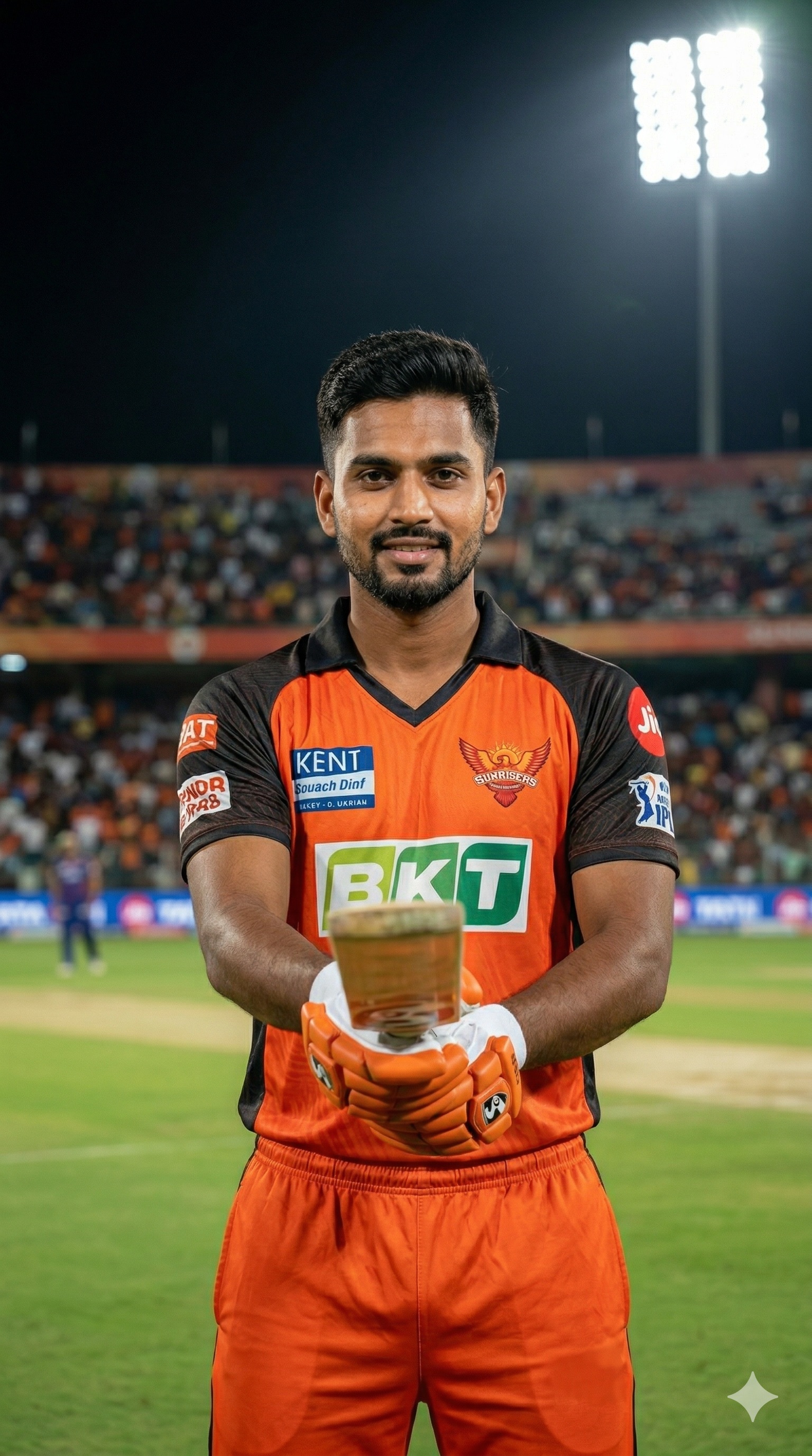 **Main Subject:** Ultra-realistic IPL cricket portrait of a North Indian man. Use the face from the provided reference image (Image 1) to maintain exact identity, facial features, and skin tone. **Pose & Framing:** Vertical portrait orientation (9:16 aspect ratio). Full-body framing matching Image 4. The player is in a confident stance, holding a wooden cricket bat horizontally with both hands pushed forward (right hand lower, left hand upper). Direct eye contact with a subtle, confident smile. **Attire:** Authentic Sunrisers Hyderabad (SRH) kit. Orange jersey with black sleeves and side panels. Matching orange cricket shorts. Detailed fabric texture showing realistic folds, stitching, and sharp, readable sponsor logos (Kent, Jio, BKT). The player is wearing professional orange cricket gloves. **Environment:** A dynamic night match atmosphere at a cricket stadium. Standing on a detailed green pitch. Background features a packed stadium crowd with a heavy bokeh effect (blurred). Bright stadium floodlights create realistic highlights and professional sports photography lighting. **Technical Specs:** Professional sports photography style, sharp focus on the face, natural shadows, shallow depth of field, high detail, 4K resolution, cinematic lighting. **Negative Prompt:** Face distortion, identity swap, extra fingers, deformed hands, wrong anatomy, blur on face, watermark, cartoon, anime, messy text, misspelled logos, empty studio.