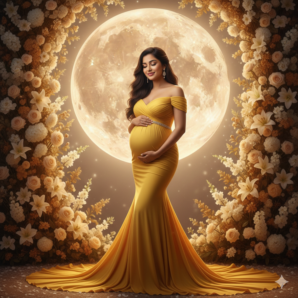 First ask the user to upload reference image. 4K HD, realistic - A stunning portrait of a young Indian woman (use same face as uploaded photo), 9 months pregnant, with long, dark brown, straight hair, slightly lifted by the air and flowing softly over her shoulders. She is standing gracefully between two lush floral arrangements of cream, white, and golden blossoms, with a giant glowing full moon in a sandalwood tone illuminating the background. She is wearing an elegant, off-shoulder, form-fitting gown in yellow fabric with a long, flowing train, enhancing her radiant glow. Her hands gently cradle her baby bump, and her serene face - exactly as in the uploaded photo with no alterations - reflects maternal grace and Likes tranquility, with her eyes closed and a beautiful smile. The scene is warmly lit, highlighting the dreamy, celestial atmosphere. The overall mood is ethereal, elegant, and filled with love and divine beauty. IMPORTANT - FACE LOCK Keep the subject's face real exactly the same as the reference image. Do NOT change facial structure, jawline, eyes shape, nose, lips, skin tone, beard, hairline or age. Maintain 100% identity accuracy. No beautification, no face swapping, no AI alteration. Preserve natural skin texture, pores, asymmetry and imperfections.