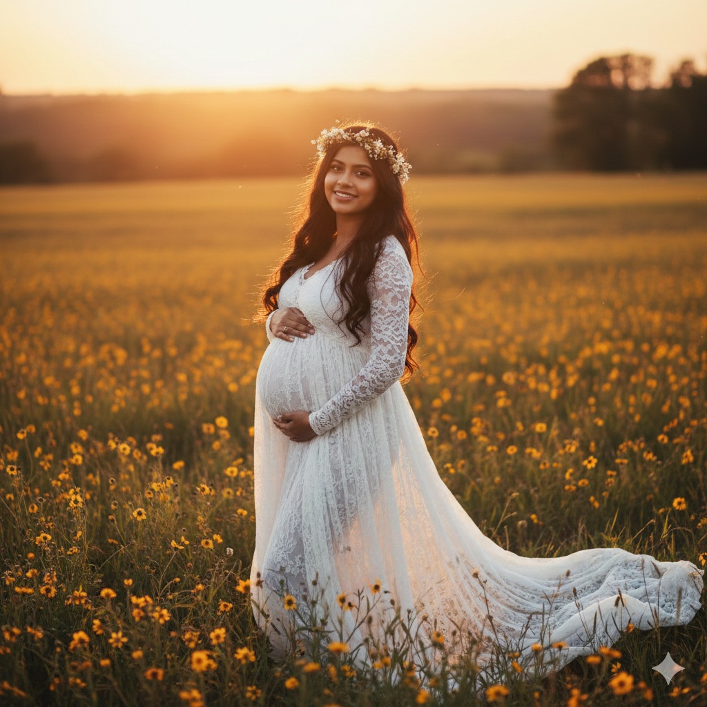 First ask the user to upload a photo for reference. 4K HD, realistic - A stunning portrait of a young Indian woman (use same face as uploaded photo), 9 months pregnant, with long, dark brown hair flowing softly over her shoulders, wearing a white wide-brimmed straw hat. A natural outdoor shot captures her standing stright gracefully in a cream off-shoulder maternity dress, her hands gently resting on her baby bump as she smiles warmly. The background is a rustic forest setting with soft-focus dry trees and earthy tones, enhancing the serene and organic atmosphere. The scene is illuminated with natural golden light, creating a warm, dreamy effect. The overall mood is calm, radiant, and filled with maternal grace and natural beauty. Her face is exactly the same as in the uploaded photot, with no alterations, capturing a soft, serene expression. IMPORTANT - FACE LOCK Keep the subject's face real exactly the same as the reference image. Do NOT change facial structure, jawline, eyes shape, nose, lips, skin tone, beard, hairline or age. Maintain 100% identity accuracy. No beautification, no face swapping, no AI alteration. Preserve natural skin texture, pores, asymmetry and imperfections.