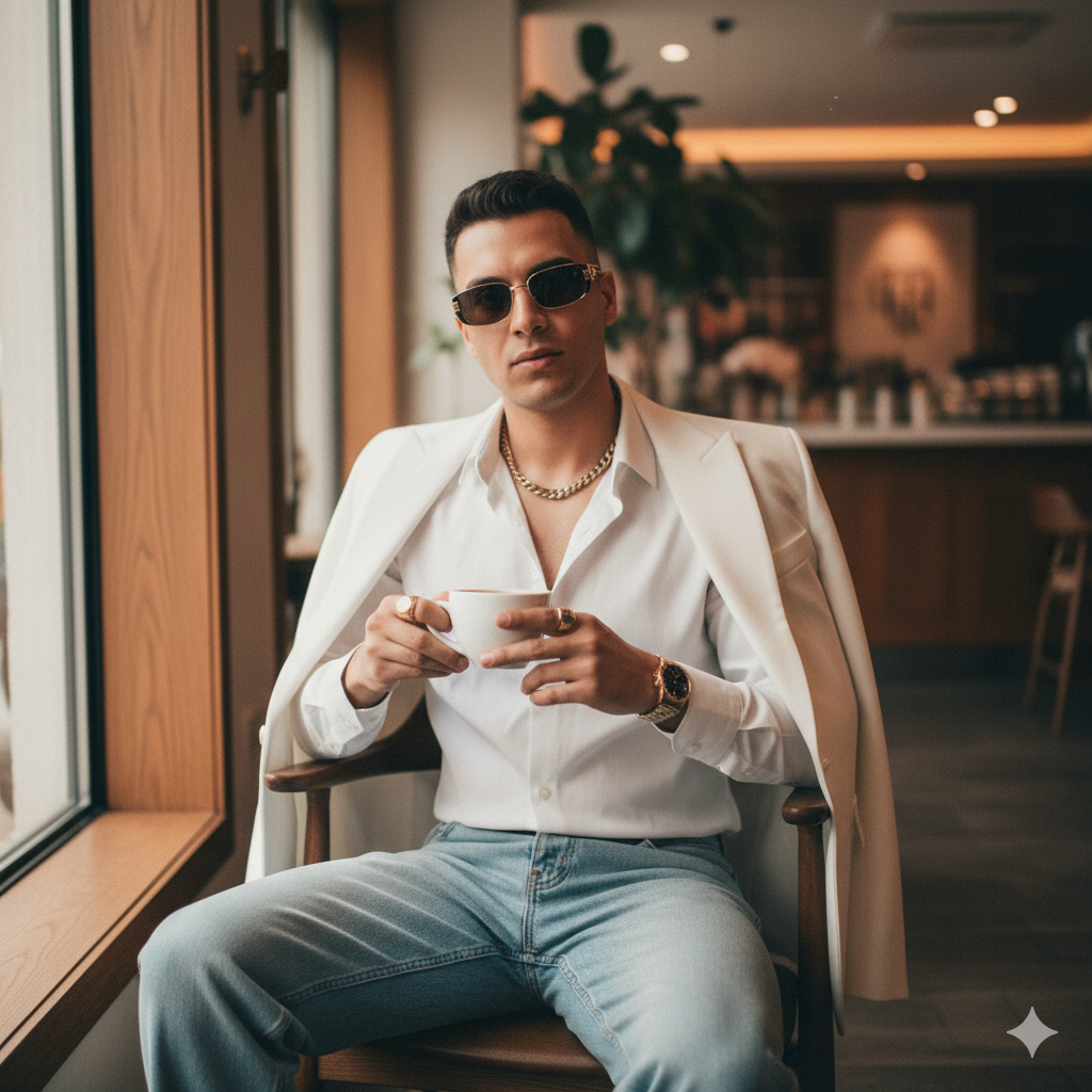 Use the attached image of the person as the sole facial and hairstyle reference, keeping the exact same face, hairstyle, and overall appearance as in the reference image with a realistic and natural look. Create a high-fashion lifestyle editorial portrait of a 20-year-old Indian man, elegant and sophisticated, sitting on a wooden chair in a modern cafe. He holds a white coffee cup in both hands in a refined gesture, exuding confidence and charm. He is wearing a structured white shirt with a white blazer casually draped over the shoulders, paired with wide-cut jeans. Accessories include rectangular sunglasses with gold details, a luxury gold watch, and a bold statement ring. His skin should appear natural, youthful, and glowing with soft highlights. The background is an elegant cafe environment, softly blurred to emphasize the subject. The lighting is soft, warm, and natural, illuminating the face and reflecting off the gold accessories to create a luxurious glow. His body posture is slightly leaning forward, evoking sophistication, elegance, and presence.