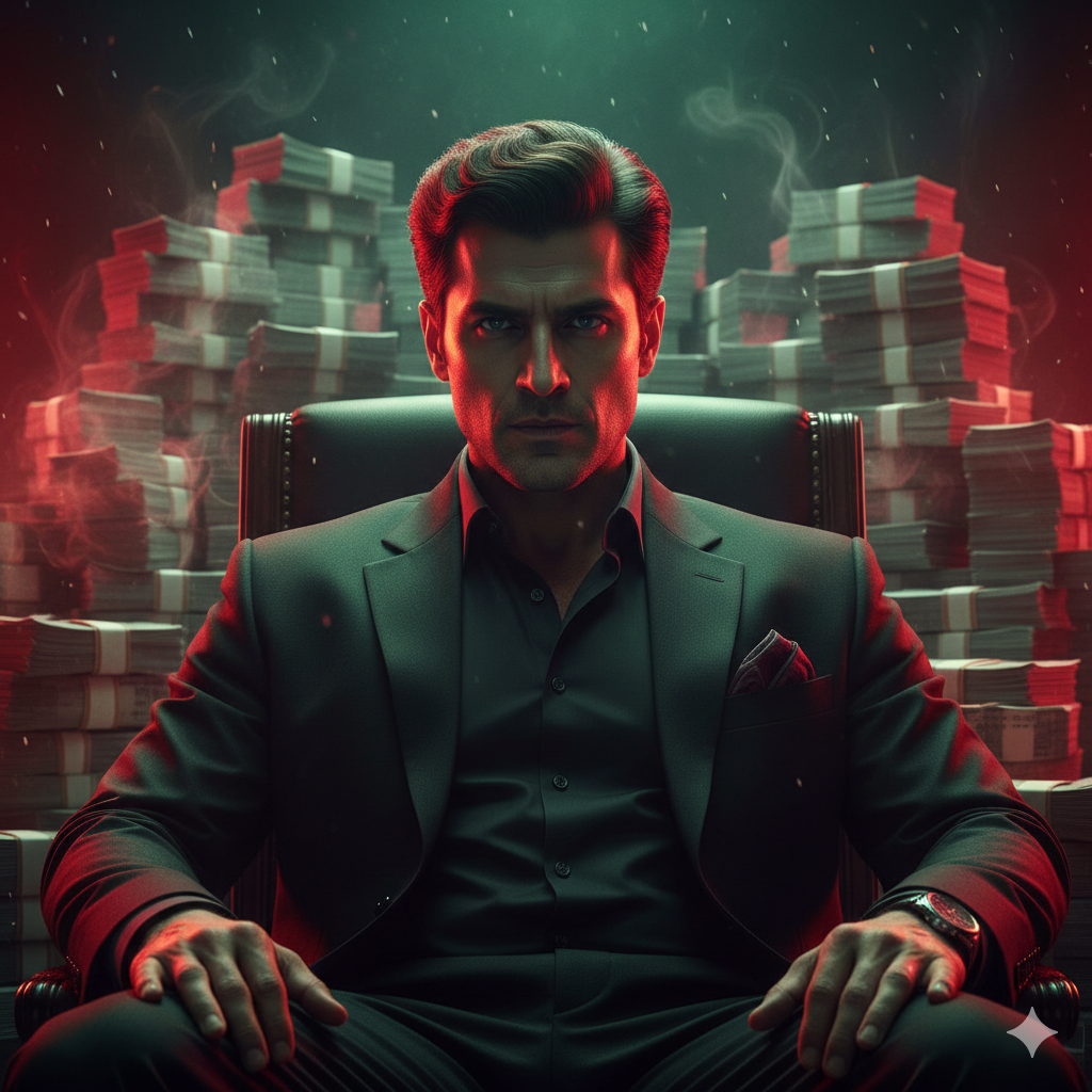 First ask user to upload a reference image. Cinematic portrait of a powerful, sharp-featured man in his late 30s with slicked-back dark hair, sitting ...