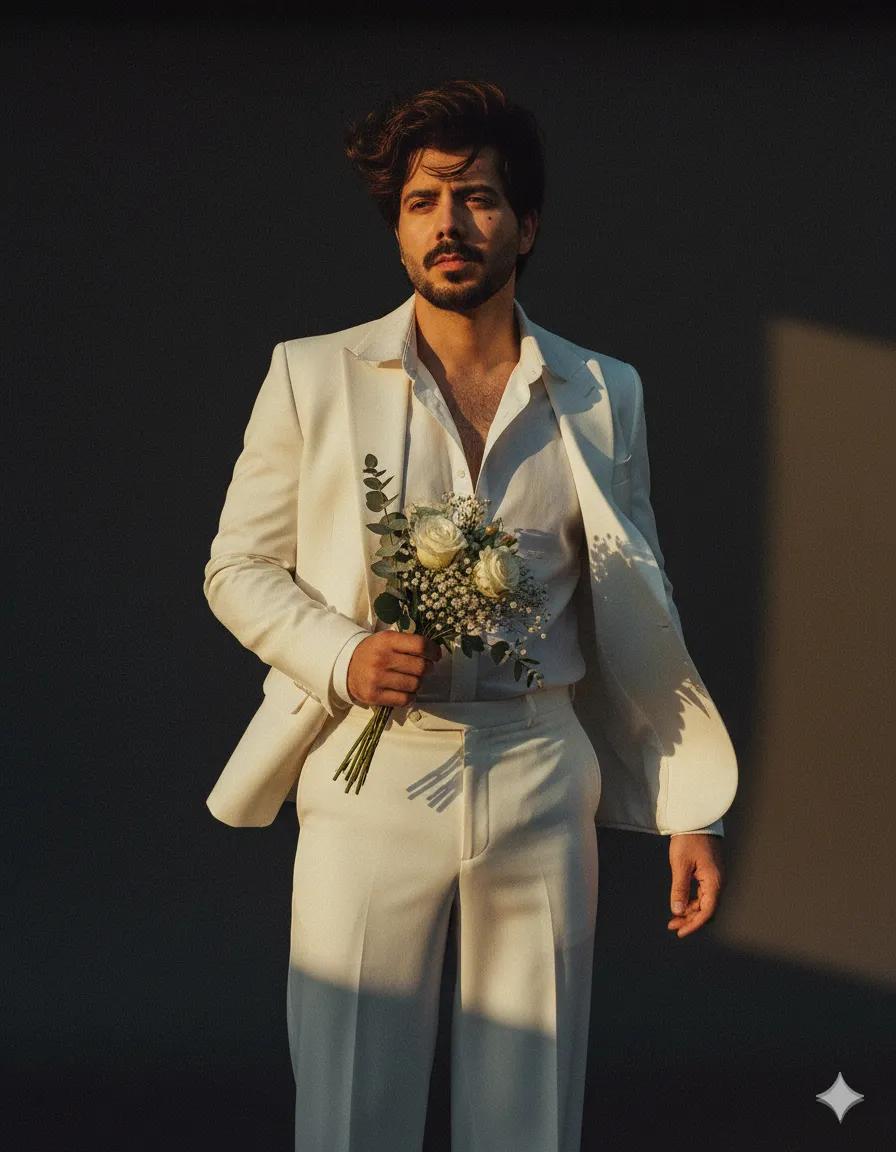 Create a retro vintage grainy but bright image of the reference picture but draped in a perfect white colour suit, Pinteresty aesthetic retro pants. It must feel like a 90s movie hair baddie with a small flower bouquet in hand and romanticising a windy environment. The man is standing against a solid deep shadow and contrast drama, creating a mysterious and artistic atmosphere where the lighting is warm with golden tones evoking a sunset or golden hour glow. The background is minimalist.