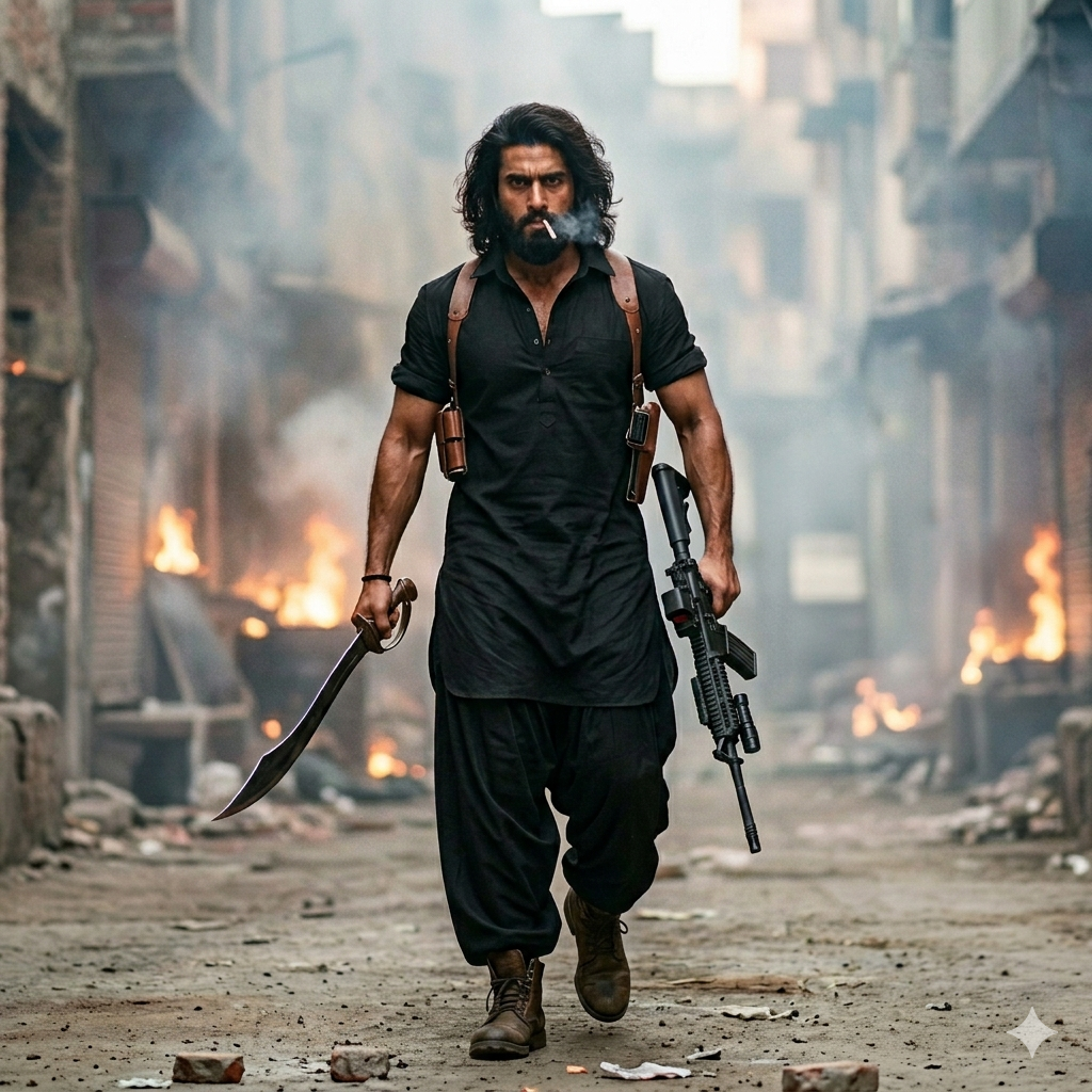 First ask the user to upload a reference image. Full-body cinematic shot of a rugged, muscular South Asian man with long, wavy dark hair and a thick beard, walking purposefully through a chaotic, smoke-filled street. He is wearing a fitted black short-sleeved kurta paired with matching voluminous pathani salwar pants. He has a leather shoulder holster and is holding a modern tactical rifle in one hand and a traditional curved blade in the other. A lit cigarette is in his mouth. The background is a blurred, war-torn urban alley with debris, fire, and distant figures in combat. Ultra-realistic, 8k resolution, dramatic high-contrast lighting, gritty film grain, hyper-detailed textures, directed by a high-budget action filmmaker style.