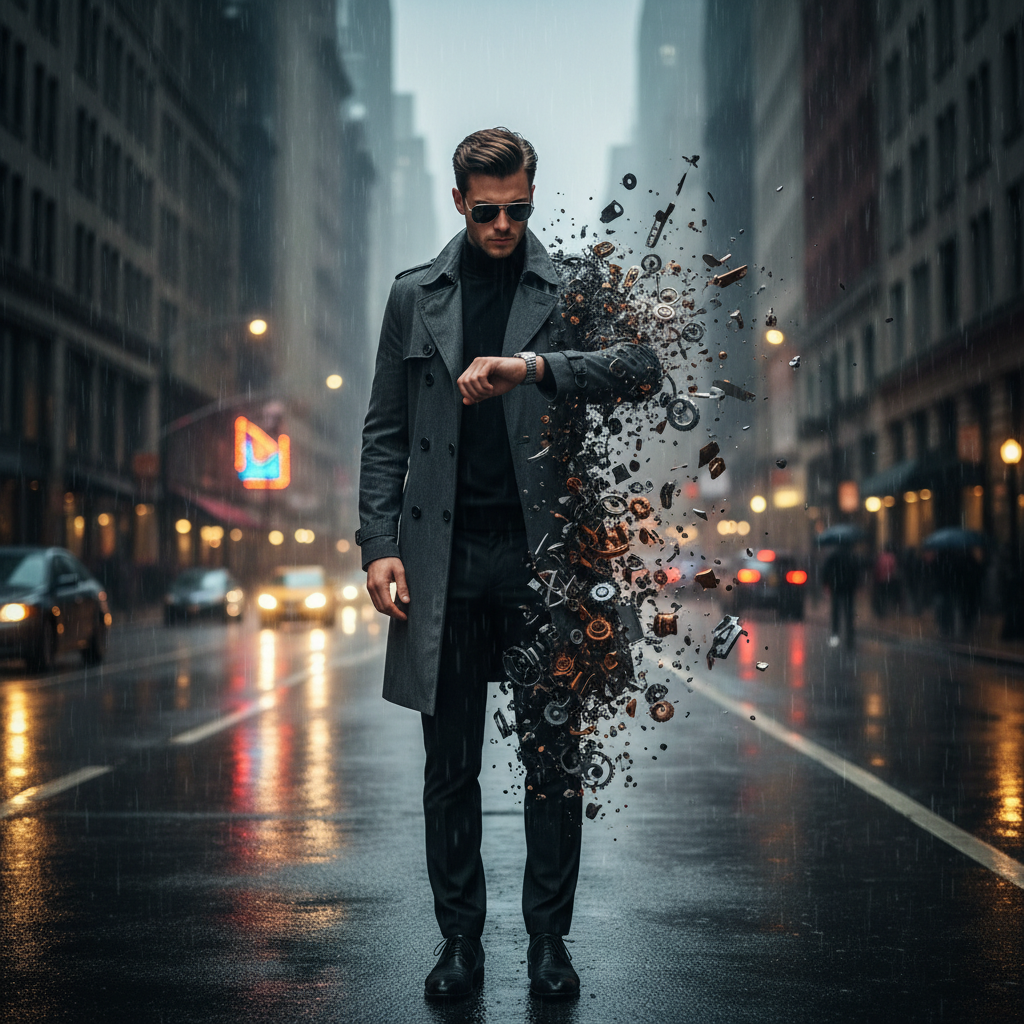 Man Disintegrating in a Rainy Urban Landscape Prompt