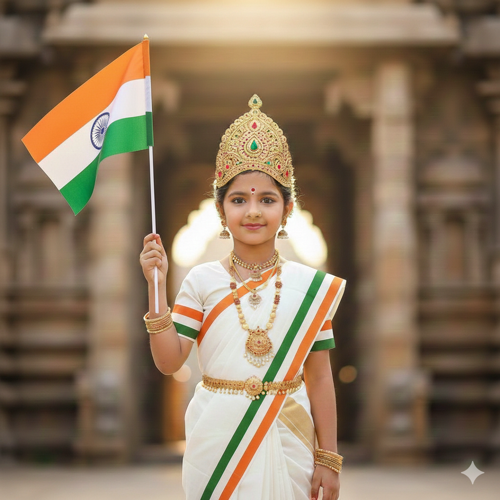 First ask the user to upload a photo for reference. A high-resolution, cinematic portrait of a young Indian girl with face same as reference photo dressed as Bharat Mata. She is wearing a traditional white saree with a vibrant saffron and green border, adorned with elaborate gold temple jewelry including a large necklace, waist belt, and a majestic golden crown (mukut) with green gemstones. She is standing in front of a softly blurred, ancient stone temple entrance with golden sunlight filtering through. In her right hand, she proudly holds a large, prominent Indian national flag on a white pole. The lighting is warm and ethereal, creating a dignified and patriotic atmosphere. IMPORTANT - FACE LOCK Keep the subject's face real exactly the same as the reference image. Do NOT change facial structure, jawline, eyes shape, nose, lips, skin tone, beard, hairline or age. Maintain 100% identity accuracy. No beautification, no face swapping, no AI alteration. Preserve natural skin texture, pores, asymmetry and imperfections.