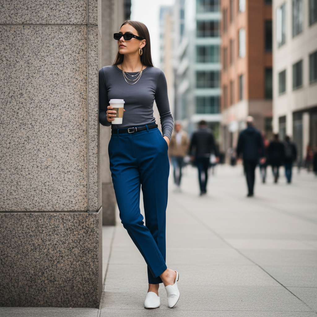 A stylish young woman is posing outdoors in an urban setting. She is leaning against a concrete structure, looking towards the side with a serious expression. She is wearing a fitted grey long-sleeved top, dark blue high-waisted trousers with a thin black belt, and white leather mule shoes. She also has on dark sunglasses and gold jewelry, including earrings and layered necklaces. In her left hand, she is holding a disposable coffee cup, while her right hand is casually tucked into her pocket. The background shows a blurred cityscape with pedestrians walking along the sidewalks and buildings on either side. The lighting suggests it is daytime, with a soft, natural light falling on the scene.