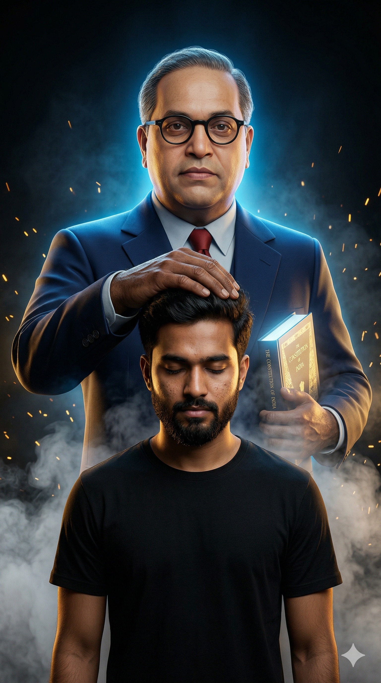 First ask the user to upload an image. A ultra-realistic vertical portrait shot with a dramatic low-angle perspective, focusing on a young Indian man standing in the foreground, his head slightly bowed in reverence, eyes closed, wearing a plain black crewneck t-shirt. He has a dark beard with natural texture and defined facial pores. One large, weathered hand with darker skin tone, belonging to a massive figure emerging behind him, is placed gently on top of the man's head as a blessing. The large figure, appearing like a towering guardian presence, is Dr. Babasaheb Ambedkar, meticulously rendered to match historical photographs, wearing iconic round black-framed glasses, neatly combed grey hair, a formal dark navy blue suit, a red tie, and a calm, dignified expression. In his left hand, Ambedkar holds a subtly glowing hardcover book with the text 'THE CONSTITUTION OF INDIA' clearly visible. Intense volumetric blue and golden light emanates from directly behind Ambedkar, creating a cool blue rim light around him and the upper parts of the scene, while a warm amber key light illuminates the young man and Ambedkar's face. Dense white smoke drifts around their feet and lower bodies, while golden sparks float against a deep black, shadowy studio background. High contrast moody lighting creates dramatic shadows. Sharp focus on the young man's face and Ambedkar's hand. Shallow cinematic depth of field. Professional cinematic color grading, ultra-detailed 8K texture showing natural skin pores and fabric weaves.