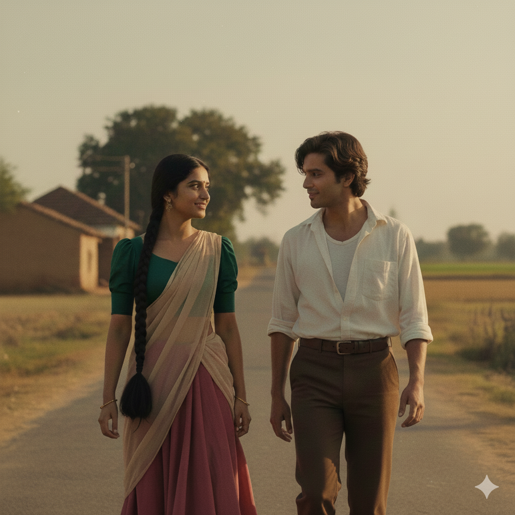 A nostalgic 1950s cinematic film still set in rural South Asia. A young couple in their 20s walks together during the golden hour; the man gazes at the woman with a tender, courting expression. She wears a traditional half-saree featuring a dark green puff-sleeved blouse, a beige chiffon dupatta, and a dark pink skirt, her hair styled in a classic braid. He wears a dusty, open white shirt over a white T-shirt with high-waisted dark trousers and wavy hair. Crucial: Use the exact faces from the attached reference image with 100% fidelity, maintaining all original facial features without alteration. Muted sepia tones, visible 35mm film grain, and a soft-focus background.
