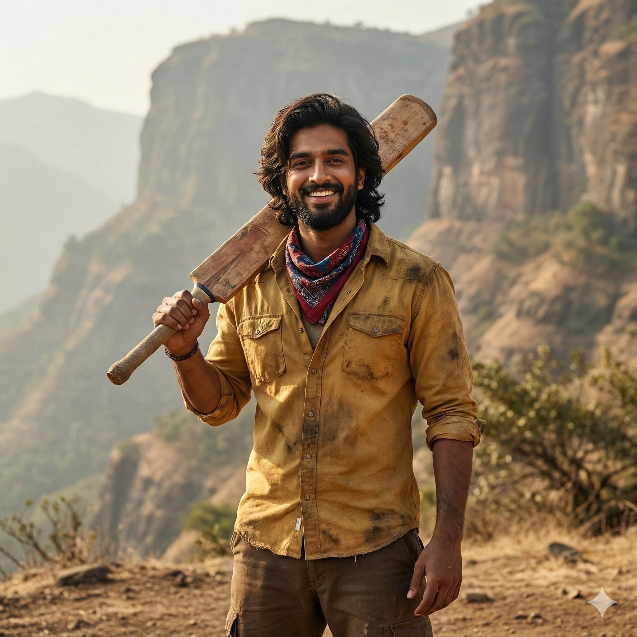 A photorealistic, cinematic medium shot of a rugged man with shoulder-length wavy dark hair and a full beard, smiling with a swaggering expression. He...