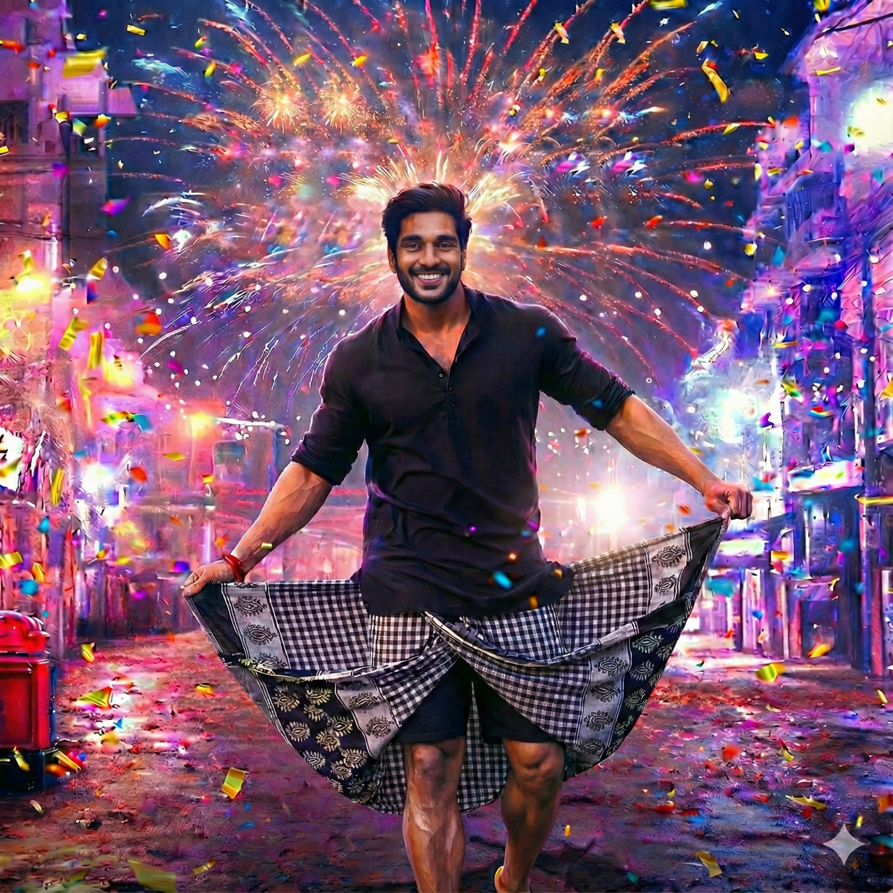 A hyper-realistic, cinematic full-body shot of a handsome Indian man with a beard and messy hair, dancing joyfully in the middle of a festive street at night. He is wearing a dark, solid-colored shirt and a traditional black and white small-patterned lungi. He is holding the edges of the lungi outstretched with both hands in a dynamic dance move, revealing black mid-thigh length shorts worn underneath. He is wearing sandals. The background is an explosion of celebration with vibrant fireworks bursting directly behind him, colorful confetti raining down, and bright street lights in hues of purple, pink, and gold. The image should have high-definition photography details, 8k resolution, and a movie poster aesthetic.