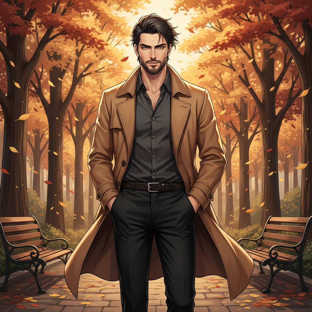 The image depicts a handsome, stylish man standing confidently in a park with an autumnal atmosphere. He has dark hair, a well-groomed beard, and striking eyes. He is dressed in a dark button-up shirt, dark trousers, and a long, brown trench coat that billows slightly in an implied breeze. His hands are casually placed in his pockets. The background is a park scene in autumn. The trees lining the pathway have golden and orange leaves, and leaves are gently falling. There are park benches visible on either side of the path, and the overall lighting suggests a warm, sunny day. The style is reminiscent of an anime or digital illustration, with smooth lines and soft shading.