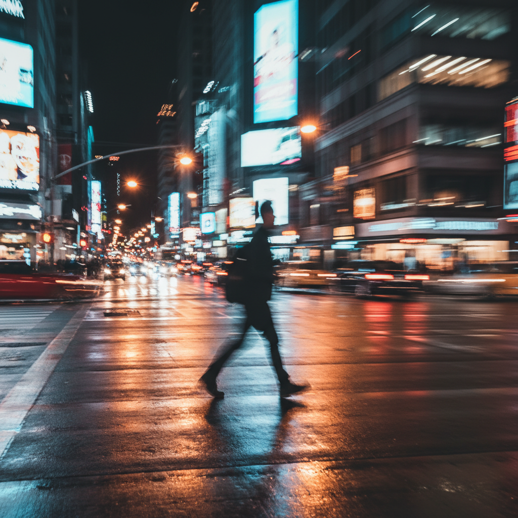 The image is a long exposure shot of a street scene, likely in a city at night. The background is a blur of colorful lights, primarily reds, oranges, blues, and whites, suggesting city lights and advertisements. A figure of a person is captured in motion, appearing as a slightly blurred silhouette against the bright lights. The person seems to be walking or running across the street. The ground reflects some of the vibrant colors, adding to the dynamism of the scene. The overall effect creates a sense of movement, energy, and the fast-paced nature of urban life.