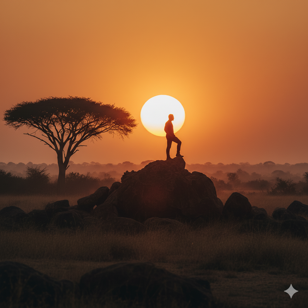 A cinematic silhouette of a man standing on a rocky outcrop in an African savanna at sunset, looking to the right side, with one leg raised onto a rock and his hand resting on his thigh. A large, perfectly round, glowing orange sun is setting directly behind the man's head, creating a halo effect. To the left is the silhouette of a large acacia tree. The atmosphere is hazy and warm, with a strong orange and black color palette.