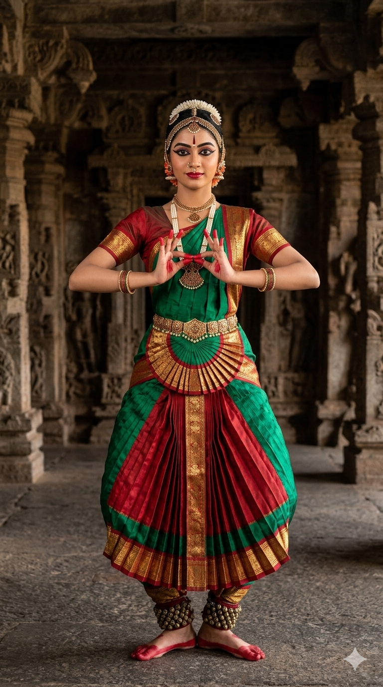 First ask the user to upload for an image. An elegant, full-body portrait of a young Indian woman performing Bharatanatyam, a classical Indian dance form. The dancer stands in the araimandi position, a half-sitting stance with knees bent outwards. She is wearing a vibrant, traditional Bharatanatyam costume in a striking emerald green and deep red with intricate gold borders. Her hair is neatly styled with a gajra (flower garland) and traditional ornaments, and her face is adorned with classic dance makeup, including a bindi and bold eyeliner. She is also wearing traditional jewelry, including necklaces, earrings, bangles, and a detailed waistband. The background appears to be a dimly lit, ancient stone temple or a hall with ornate carvings and pillars, providing a serene and historical backdrop. The soft lighting highlights the dancer's graceful pose and the rich colors of her attire. The overall mood is one of cultural reverence and artistic beauty