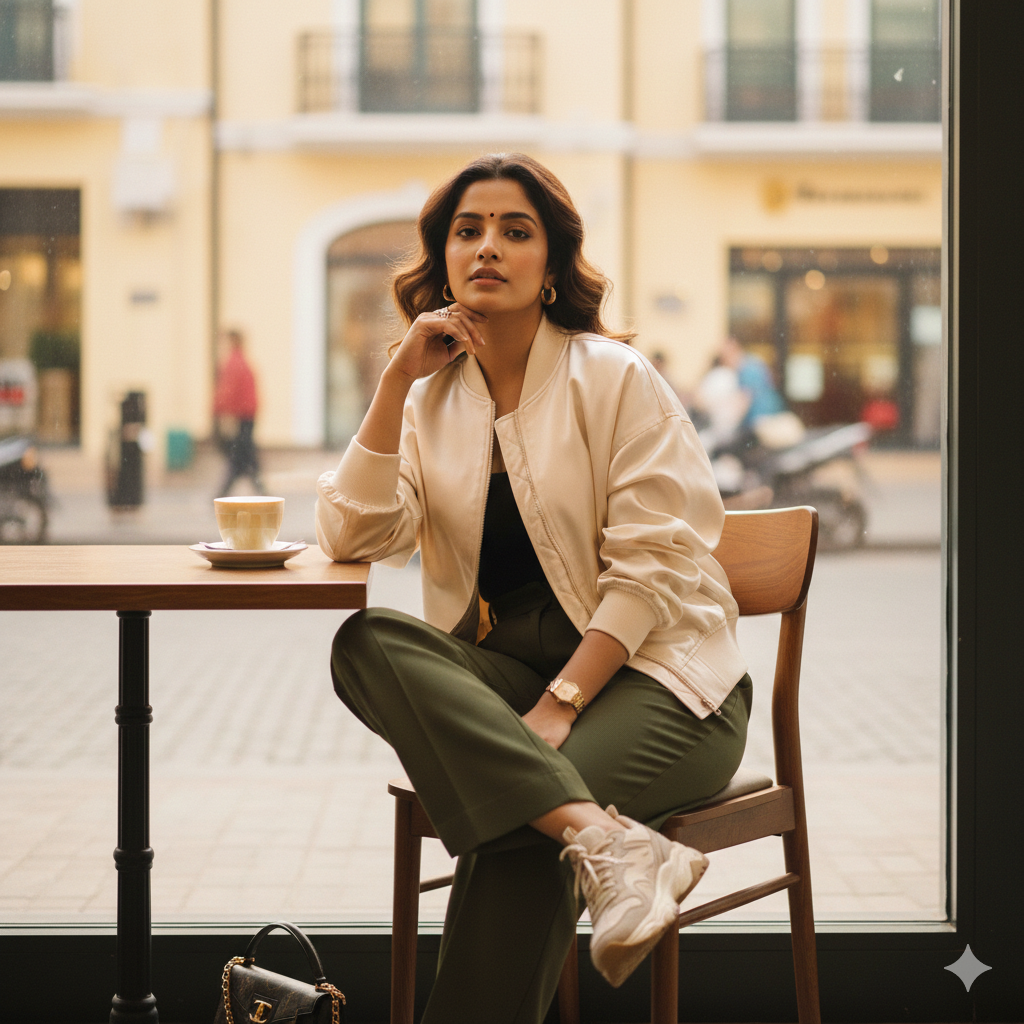 Using my exact face from the attached photo. A hyper-realistic 8K full-body vertical fashion editorial portrait (9:16) of a young woman styled in chic luxury streetwear, posed as if for a Vogue magazine spread. She sits elegantly at a stylish café table by a large glass window, legs crossed with confident posture, one hand gently resting under her chin while the other drapes casually on the table.