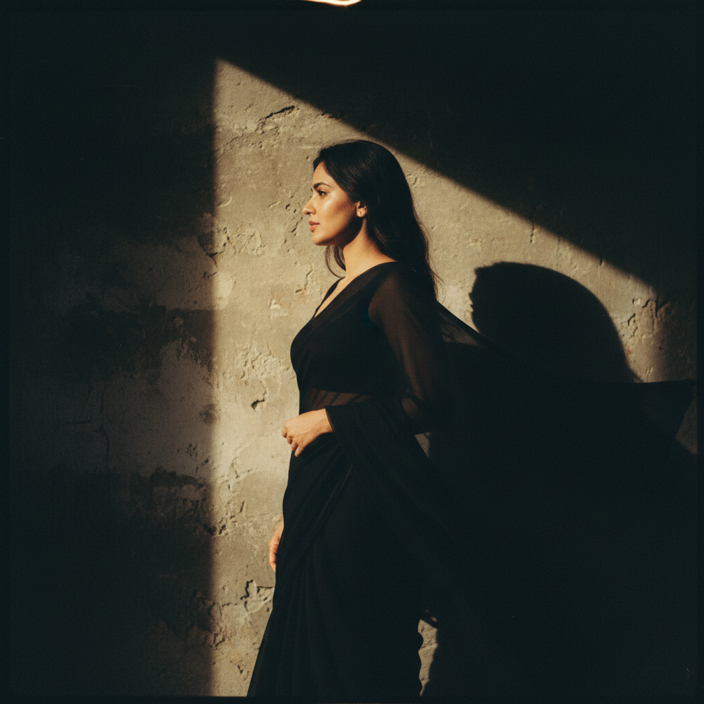 A retro grainy cinematic portrait of the same woman, preserve exact face, draped in a plain black chiffon saree. She stands against a textured wall, golden light slicing across her profile while deep shadows create mystery. Wind lifts the pallu lightly, evoking a 90s film still.