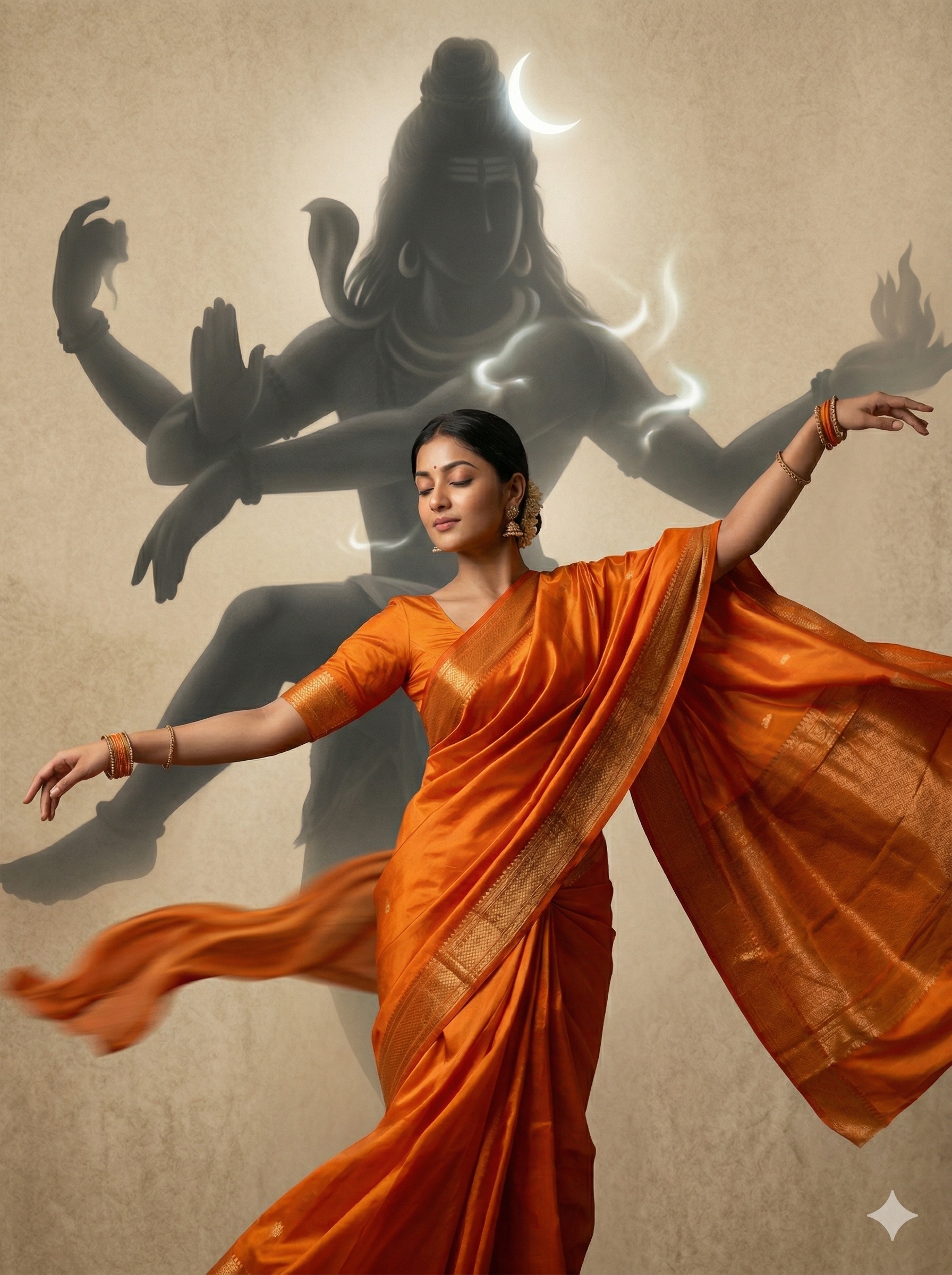 A hyper-realistic 8k photo of a beautiful girl(use same face as uploaded in refference image, keep her real face unchanged) in a graceful dancing pose. She is wearing a vibrant, flowing orange silk saree that swirls dramatically around her. Her expression is serene with closed eyes. Behind her, Lord Shiva with also dance pose appears as a towering, ethereal dark silhouette in charcoal tones, with a glowing white crescent moon in his hair. The background is a textured, sandy beige parchment style. The lighting should be cinematic and soft, focusing on the fabric texture of her clothes. Extremely detailed, high contrast, mythological atmosphere, photorealistic style.